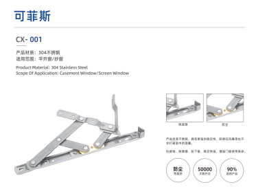 滑撑、风撑一般为不锈钢材质,而合页(铰链)有不锈钢、铝合金等 多种材质。