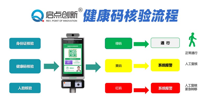 人脸识别健康码通行一体机可以同时满足“检测体温”、“查验健康码”和“身份核验”三重功能需求的智能人脸识别测温终端产品,能够实现在校园、医院、银行、办公写字楼、养老机构、政务中心、景区出入口、交通出入口、中心商业城、工业产业园区、企事业单位、大厦物业服务中心、各政府单位、密闭(半密闭)的经营性服务场所及公共服务场所等需要进行检测体温、查验健康码、身份识别和门禁通行控制的复杂应用场景。通过打通全国各地的防疫健康码应用接口后,可高效地完成人员的刷脸自动测温、与身份证完成人证比对,亮出健康码扫码后调出个人的健康码信息,智能语音提醒(智能变色状态提醒)播报体温信息和健康码的状态,绿码通行,黄码红码告警。省人,省时,避免感染!