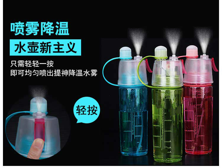 这款喷雾杯精心打造,便携实用,杯身PC材质,环保健康。高雾化喷口,细腻柔和,给您更贴心的呵护;按钮根据人体工学设计,男女都适合,轻松好按不卡壳。容量有大有小,颜色多样。喷雾杯喝喷两用。