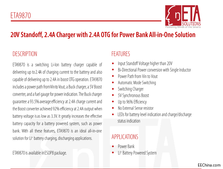 ETA9870是5V-2.4A充放电的移动电源芯片,自动负载启动,内置20V耐压能力,可用于移动电源,带4 LED电量灯,采用了ESOP8封装。