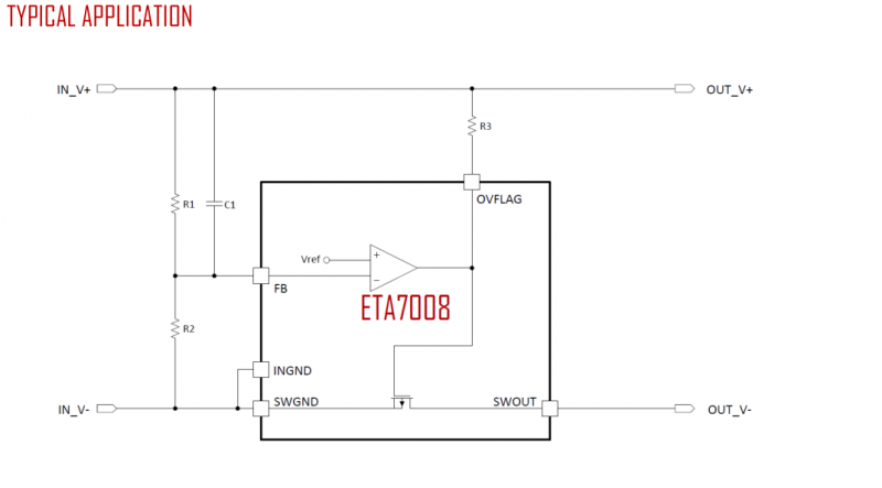 ETA7018低侧过电压OVP, IC只有34mohm开关,采用低压侧保护拓扑保证非常低的电阻和高电压保护. ETA7018由电压比较器、一个开关和一个34mohm功率NMOS管干燥器。