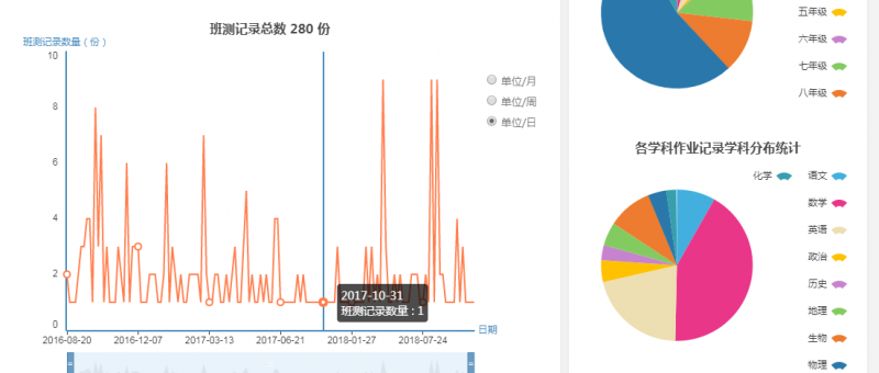 智慧管理平台:为每个学校提供全面的教与学的大数据呈现,通过精准的教与学过程中的数据收集与分析,用图表的形式直观呈现学校的教学情况。为管理者科学决策提供详细的数据支撑。