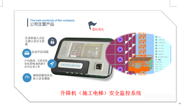 施工升降机安全监控系统采用了液晶显示器及语音发生器,能够直观的反应监控数据,显示升降机运行状态。