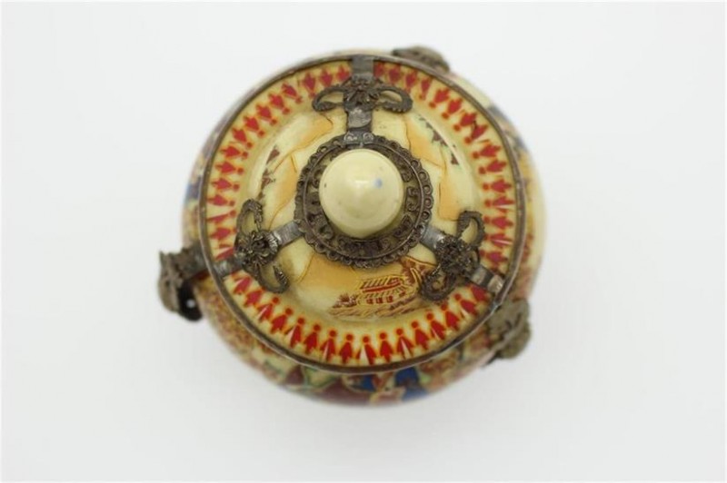 此件瓷包银黄地五彩人物故事纹盖罐(将军罐仕女图),画工精美,包银工艺精堪,极具艺术和收藏价值