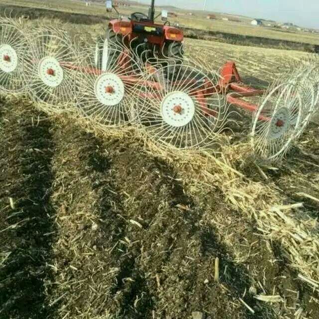 指盘搂草机系列,适合挂接在轮式拖拉机的三点悬挂装置上,工作部件为带搂齿的指盘,机器靠指盘按顺序传至后一个指盘,直到形成松散通风的草条为止。改变指盘的角度可以调节草条的宽度。搂齿为长弹簧钢齿,梳草作用好,仿形性能强,搂齿在轮毂上形成辐射状配置,可消除风力影响,便于尘土通过。用拉力弹簧控制指盘对地面的压力,可根据作物和地面条件,通过拉伸调节板调节着地压力。运输时可以将指盘转到拖拉机后方。该机结构简单,操作方便,使用可靠,故障少,功效高,作业质量好。保养简便,动力配套性能好。并且既能搂草,又可进行翻晒作业(可将搂集成条的草条重新摊开)。该机与我厂生产的割草机配套使用,可将割幅形成的三个草条搂集成一个均匀的草条,便于随后的打捆作业。