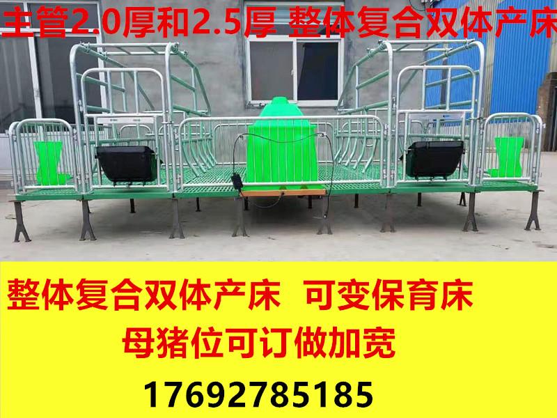 母猪产床又称为连体产床,双体产床,分娩产床,都是母猪产床的别名。母猪产床设备,有两个猪位的,也有一个猪位的,可以根据客户需求定制。两个猪位的母猪产床带有两个保温箱。母猪产床上架管是采用热镀锌的,保你十五年不生锈的,管厚2.0,2.5的您需要什么样的配置我们都可以加工。