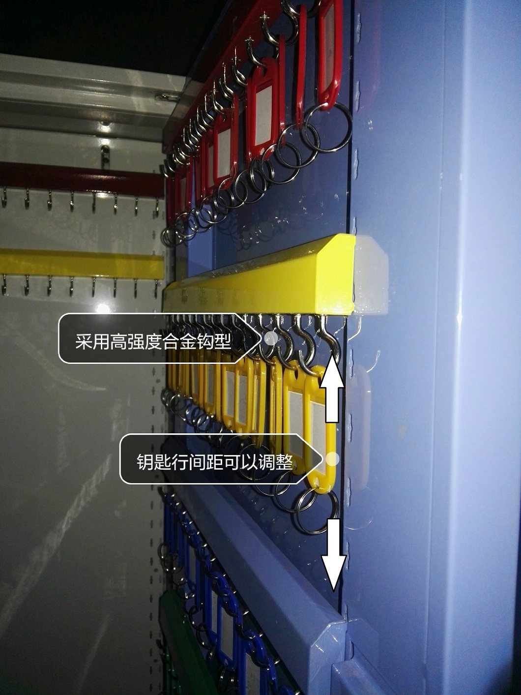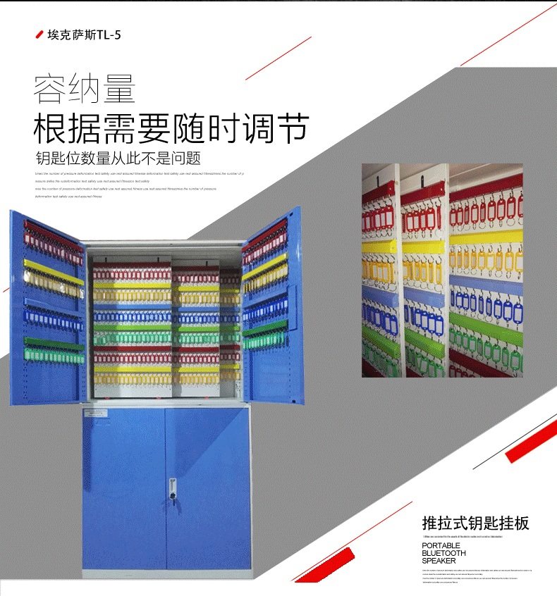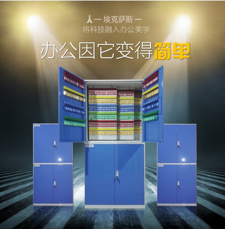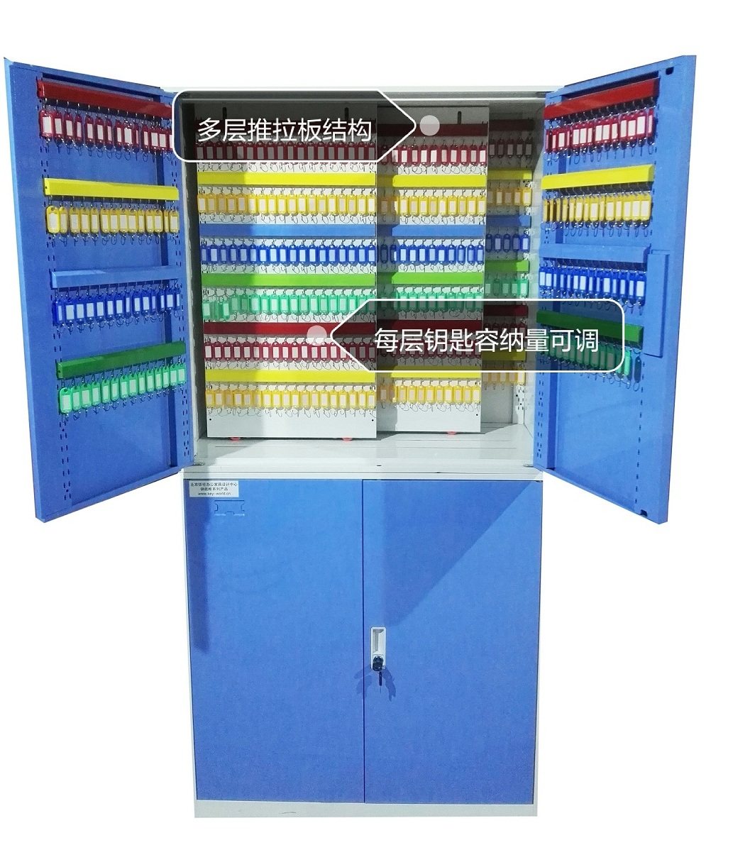 本产品采用优质冷轧钢板制造,板厚为1.0MM,柜体可以容纳576位,每片推拉板可容纳144位,单柜体最大可容纳2000位,钥匙行间距为100MM,列间距为25MM。