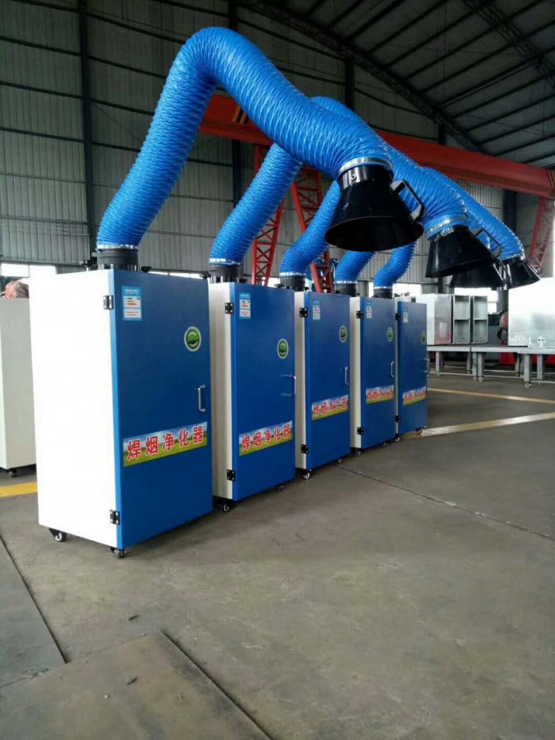 烟尘通过焊烟净化器产生的负压由吸气罩吸入粉尘,经柔性吸气臂进入腔体,流速变慢使大颗粒直径的粉尘掉落下来,含微细粉尘的气流进入净化室内,粉尘的过滤分离在净化室内通过滤筒的分离的作用完成,烟尘则被滤芯阻拦在其表面上,净化后的空气经风机排出,当被阻拦的烟尘在滤芯表面不断沉积时,定时开启脉冲清灰系统,手动清灰式需将过滤桶取出手工清理,静电式需定期清洗电极板。