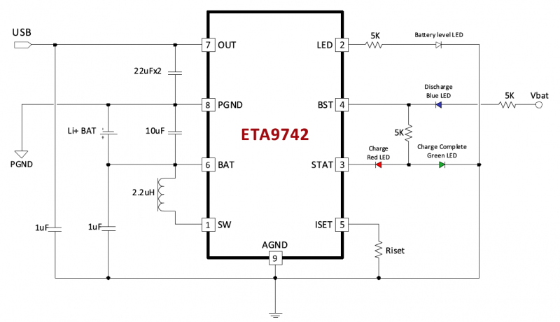 描述FEATURESETA 9742是一种开关式锂离子电池充电器,它能向电池提供最多3A的充电电流,并能在升压工作中提供高达5V/2.4A的电流。在充电模式和升压模式下都具有高效率。它还包括一个用于功率指示的燃油表系统。对于充电,它使用一种消除当前sen的专有控制方案。硒电阻用于常规恒流控制,最大限度地提高效率,缩短充电时间,降低成本。它还可以输出5V的电压在相反的方向,从t升压。他有电池。它只需要一个单独的感应器,就可以双向提供电源,并拥有一种专有的自动模式检测和切换方案。ETA 9742是一种理想的电池充电的全合一解决方案。D放电应用程序,如电源库、智能手机和只有一个USB端口的平板电脑,可用于充电电池功能。ETA 9742适用于4.2V锂离子电池的充电。而ETA 9742是ESP 8封装。