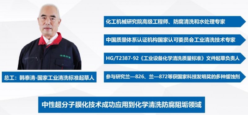 新装置开车前的化学清洗对于生产的安全、高效和环保节能等都具有重大意义,山东青洁能环保有限公司是专业的水处理药剂和化学清洗公司,公司总工韩泰清是国家化学清洗标准HG/T2387-92《工业设备化学清洗质量标准》的起草人和主要负责人,具有40多年的实践经验,他带队研发的中性超分子化学清洗,是目前很先进、环保、高效的清洗技术,使用的清洗药剂是青洁能公司生产的JN828中性超分子膜化清洗产品。