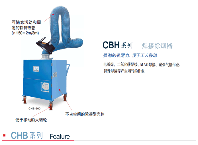 8.主要应用领域:电弧焊接:二氧化碳焊接;MAG焊接;特殊焊接发生的烟尘(强力的吸风力量,移动式,工作方便的结构) |