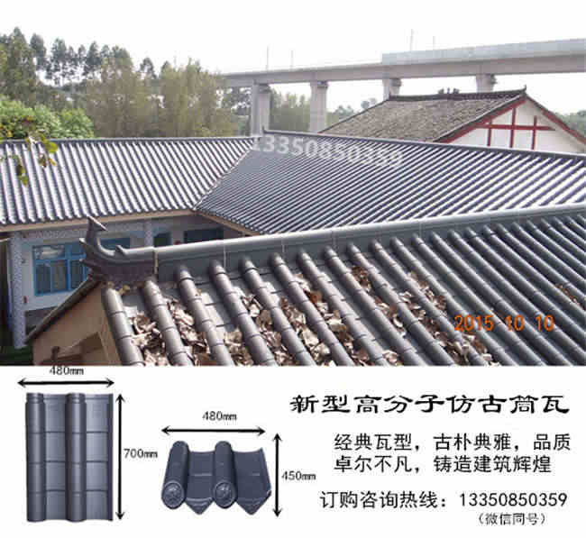 高分子瓦造型既传承了烧结青筒瓦及烧结小青瓦的古朴典雅风格,又有西式瓦充满欧式风情的现代气息,是传统建筑文化元素与现代材质和工艺的完美融合。