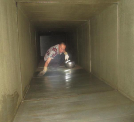 1、与烟罩同步管道基本上可以见到原有的内壁铁皮,无残留块状干涸油污。
