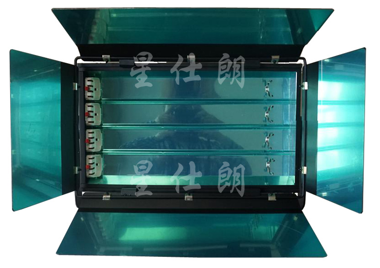 6、调节光效:打开灯具的四页反光板,通过调节反光板间的夹角,控制光的方向、反光、柔光和聚散程度;