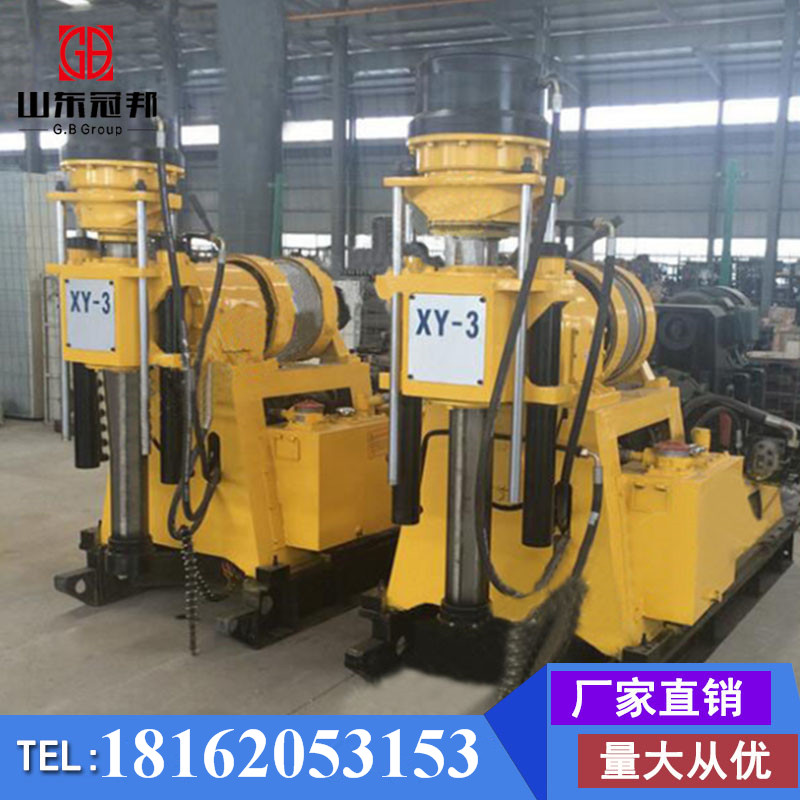 XY-3岩心钻探设备的一种,其主要用于金属及非金属固体矿产的普查与勘探,另外,也可用于工程地质勘查,水文地质调查,油气田的普查和勘探以及水井钻凿等。由于岩心钻机要求取出较完整、无混杂和非挠动的地层岩样,因此岩心钻机均为回转式钻机。