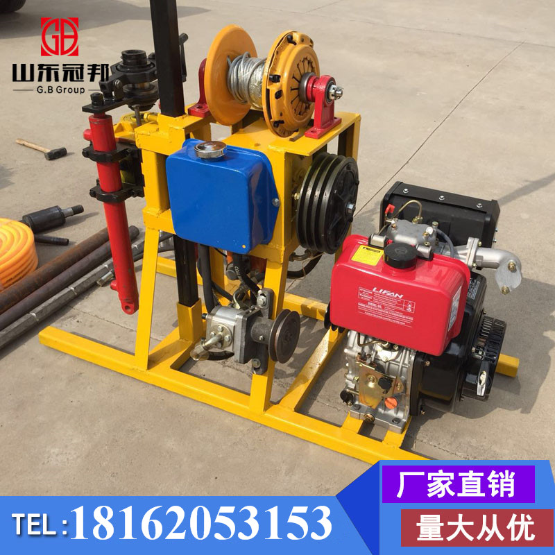4.该型号轻便钻机,配备自动卷扬提升系统,与三角塔架部分组合使用,大大节省劳动力强度,提高工作效率。