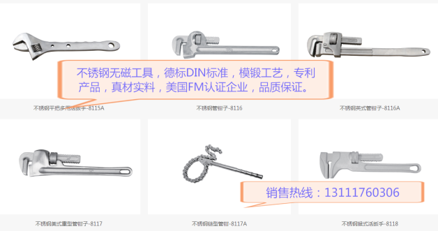 邮箱:281935698@ qq.com不锈钢材质,钛合金扳手,钢制绝缘扳手有:1、各种不锈钢扳手系列,如不锈钢敲击梅花扳手,不锈钢单头呆扳手,不锈钢活扳手、不锈钢双头梅花扳手、双呆扳手、直柄梅花扳手、弯柄呆扳手、两用扳手等; 2、不锈钢套筒及附件类,包括不锈钢套筒头、万向接头、滑行头、接杆、重型套筒扳手、内六角扳手,快速手柄、棘轮扳手等; 3、不锈钢锤子类,如八角锤、奶头锤、德式八角锤等; 4、不锈钢螺丝刀类,如一字螺丝刀、十字螺丝刀、泥子刀、削皮刀、铁皮剪刀、扁铲、敲击螺丝刀等;5、不锈钢钳子类,如克丝钳、尖嘴钳、斜口钳、鲤鱼钳、水泵钳等 6、不锈钢镊子、不锈钢撬棍、不锈钢起钉器等。该产品在一些需要防磁的特殊工作环境中能有效的起到防磁的效果,防止危险事故的发生,确保国家财产和人身安全。活扳手其规格包括:150、200、250、300、375、450、600(mm),相对应的尺寸为:6"、8"、10"、12"、15"、18"、24"。公司还可根据用户的需求,