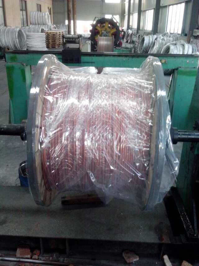 铜覆钢圆线又名(镀铜钢圆线,铜包钢接地线,铜镀钢圆线)单根铜覆钢圆线是我公司采用最先进连续四维电镀法或连铸等工艺制作的新型接地体,采用最先进的工艺将纯度99.9%铜覆盖至特制钢芯表面制成,导电性能与同等直径铜棒相同,但造价远低于纯铜,防腐性能远胜于镀锌钢材,具有导电性能好,低电阻、防腐性能优越、运输方便、施工方便、施工效率高等诸多优点,是替代圆钢、角钢、镀锌扁钢等传统接地材料的最佳选择;国电天邦公司生产的铜覆接地圆线采用冷拉圆钢,外镀0.254mm厚度纯铜,铜层牢固,耐腐蚀性强,弯曲180°不脱落、不开裂。铜覆钢接地圆线和生产铜覆钢接地棒的工艺几乎相同,都是采用连续四维电镀法、连铸等工艺制作,区别在于铜覆钢接地圆线覆铜后使用大型回火炉进行回火处理,相比较铜覆钢接地棒更为软态,生产时即能制成盘型,能够在工地调直(直径超过14mm的铜覆钢接地圆线调直难度较大,人工难以调直,建议使用卷扬机等设备)和折弯,这也和铜覆钢圆线往往用在水平接地极的用途是相符的;铜覆钢圆线分为直线型和盘型,直线型规格一般为6米/根,盘型规格一般为100米/卷,也可定制其它长度规格。
