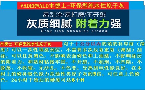 A型为~水性纳米可填色型高分子网状纤维(粉状),固化剂B型为~纯水性高分子膨化型交联发生剂(液态),两者皆为纯水性,无VOCS,不含有机溶剂,不含有毒有害物质,无毒无味、绿色环保;阻燃不怕火,阻燃级别B1,可耐高温380度,AB剂混合所发生的固化反应~属交联交叉自结晶反应;不产生任何有毒气体流出,故可以对于十公分以内的填补厚度(深度)进行一次性填涂到位,不需要多次反复重复(薄刮)刮涂。干透后不影响涂层的附着力,在木材上的修补吸色能力是油性类原子灰的3-5倍,干透后的最高硬度可达6个H。其具有常温固化、干燥速度快、易涂刮、不易起皮、不易色变、不易凹陷、不易脱粉、不易开裂、不易收缩、延伸性好、透气性能强、易打磨抛光、附着力强、施工简便、被涂表面光滑、和基材粘接牢固、导热到电性能良好等一系列优点。常温下VADERWALD木德士-环保型水性原子灰A B剂混合后10-20分钟内表干(冬季30-40分钟)即可进行堆放叠加处理,不需加热干燥,节省工序,缩短流程时间,主要适用于修补木地板,大板,家具的结疤,缺料,凹坑以及较大尺寸的裂缝。