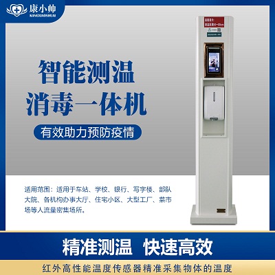 智能测消毒一体机,适用于车站、学校、银行、写字楼、大院、各机构办事大厅、住宅小区、大型工厂、菜市场等人流量密集场所。通过红外热成像的原理采集物体的温度,感应距离50-80cm,具有高精度和高分辨率,对环境和日光免疫,干扰小,室温下测量误差±0.3℃。其中主机含有电源装置、控制装置、传感器装置,消毒装置。主要功能:1.人脸识别测温,人脸识别测温,人脸识别快速通行,非接触式精准测温,智能高温预警拦截,减少不必要接触。2.红外感应消毒洗手,自动感应后滴出可搓拭的消毒液,从而达到消毒效果,避免手中的病毒不断到处传。
