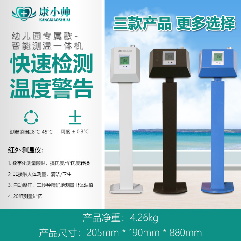 康小帅智能测温一体机之幼儿园专属款,适用于幼儿园等小孩所需测温场所。通过红外热成像原理收集温度,感应距离 5-10cm,具有高精度和高分辨率,对环境和日光干扰小,室温下测量误差±0.3℃。其中主机含有电源装置、控制装置、传感器装置。主要功能:快速测温,温度超高预警,能有效防止病毒交叉感染。参数设定: