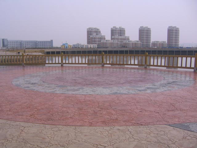 压印地坪。是一种多孔,轻质,无细骨料混凝土,由粗骨料表面包覆一层胶结料相互粘结而形成孔穴均匀分布的蜂窝状结构,故具有透水,透气和质量轻的特点;透水混凝土作为环境负荷减少型混凝土,具有与普通混凝土不同的特点即容重小,水毛细现象不显著,透水性大,胶结材料用量少,施工简单,绿色环保型和生态型的道路材料;透水混凝土地坪整体美观,透水效果良好,雨水收集充分,具有良好的经济效益和生态环境效益,同时透水混凝土具有吸声降噪,抗洪涝灾害,缓解城市的“热岛效应”等作用;对于恢复不断遭受破坏的生态环境是一种创造性的材料,将对人类的可持续发展做出贡献。