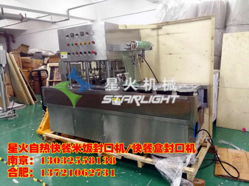 自热快餐米饭封口机/快餐盒封口机是星火针对盒装自热快餐米饭的封口而研发制造的一款封口机设备,同时也适用于各种酸奶、牛奶、豆奶、果汁饮料、调料、果酱等产品的生产。