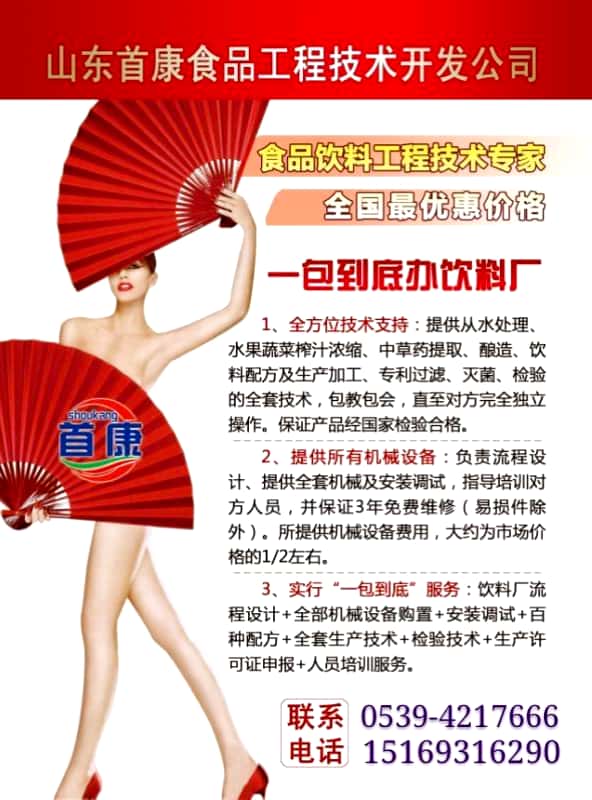 中法合资.山东首康食品工程技术开发公司是国内专业研究易拉罐、玻璃瓶、塑料瓶、屋顶包各类饮料的生产技术、全套机械设备、百种饮料的配方,为帮助正在计划创办中小饮料企业解决设备、人才、技术困乏的难题,特郑重推出以下服务: