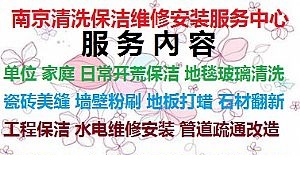 9、石材翻新:大理石翻新、花岗岩翻新、大理石结晶处理、花岗岩结晶;水磨石翻新、大理石打蜡养护、花岗岩表面打蜡养护、玻化砖打蜡养护。 南京好邻居保洁拥有一支高素质的专业技术工程施工人员和管理人员,服务形式灵活多样,价格合理 本公司多年从事:家政服务、工程开荒、家庭保洁,日常保洁,单位保洁、地毯清洗、外墙清洗、精细保洁、地板打蜡、油烟机清洗、大理石结晶养护等一系列清洗保洁服务,作为南京市一家专业的家政清洗保洁服务公司,我们始终坚持全心全意为客户提供细致周到的服务为基石;以专业的职业素质培养为企业用人标准;以品质做人、优质服务为企业经营规范。近年来,伴随着市场的需要及业内外的良好口碑,正一步步走向更高的领域。服务形式更加多样化,经营范围扩大化。我们相信多一份信赖与关注,就多一份健康与幸福,南京好管家保洁服务有限公司以**的管理、专业的技术、先进的设备、热情的服务为广大客户带来更多更好的服务。