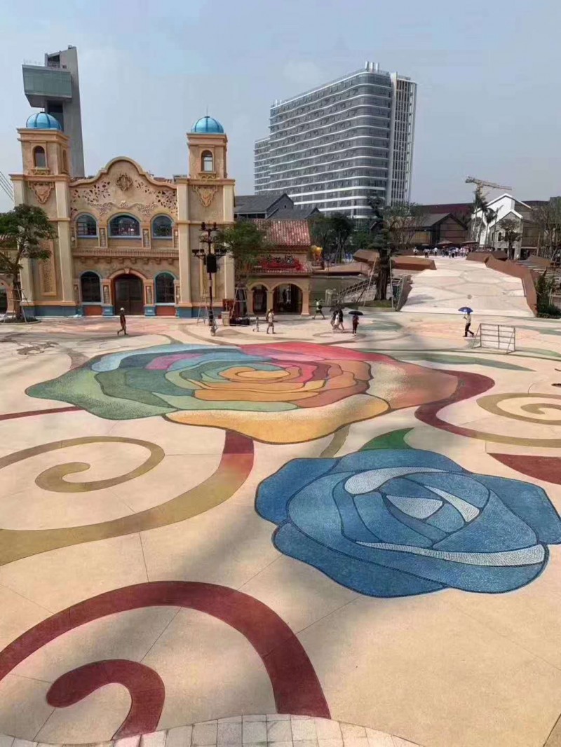 彩色混凝土砾石聚合物艺术地面分为细骨料洗砂艺术地面及租骨料砾石地面。由精致骨料、琉璃石与水泥及专用增强剂、专用染料充分搅拌后整体摊铺,通过表面专用钝化反应剂处理,清洗完成后再用专用高渗材料进行化学弥漫着色.从而展现仿石、干裂泥地仿、仿沙滩、海洋渐变、卡通图案等等艺术效果的地面。产品艺术效果逼真,防滑效果,被厂泛应用于各类游乐场、海洋公园、主题乐园地面铺装。