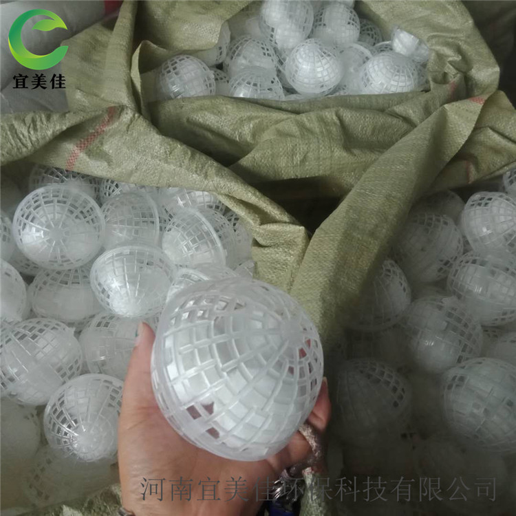 球形悬浮填料, 又称孔旋转球形悬浮填料 ,是对国内处理污水、生物膜法处理技术采用的多种填料中开发的新一系列产品。分内外双层球体,外部为网状球体,内芯有瓜片式、组合式、弹性填料、蛇皮丝、海绵、流化床、火山岩等。