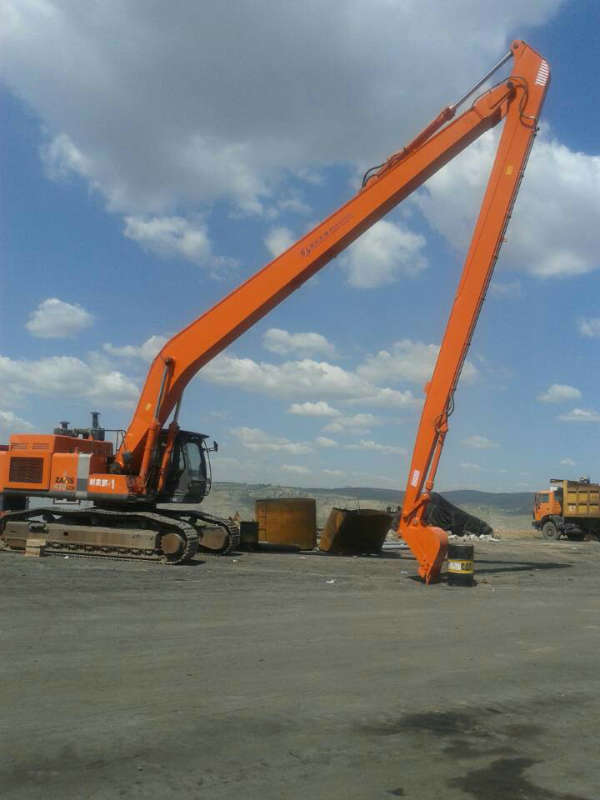 二段加长臂:二段式挖掘机加长臂主要适用于土砂、混凝土等建筑搬运、高速公路坡面修整及河道疏通清淤工程及建筑基础、河道、深沟等土石方挖掘作业,通过在原挖掘机的基础上安装挖掘机加长臂,能完成标准臂无法达到的距离,使挖掘机最大限度的发挥其用途,广泛作业于各种施工现场,使效率和安全性更高。三段式加长臂拆楼机可加长臂到16-36米,它主要适用于高层建筑的拆解等工程。