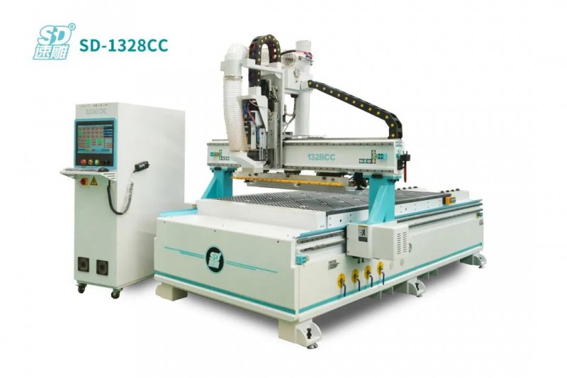 直排换刀加工中心作为一款经济型的门板加工设备,在市场应用比较广泛。直排换刀加工中心,顾名思义就是刀库是固定的一排,速雕1325CC跟随式直排换刀可以跟随龙门进行移动,换刀速度快,导轨磨损度小,节省时间能够实现自动划槽、自动扩孔、自动开料、自动推料、自动换刀等功能因为广泛用于板式家具、全屋定制、吸塑门板、桌椅门窗等行业。