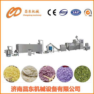 拌粉机→上料机→双螺杆膨化机→整形机→提升机→湿磨机→风送机→三层电烤箱→振动筛→(包装)