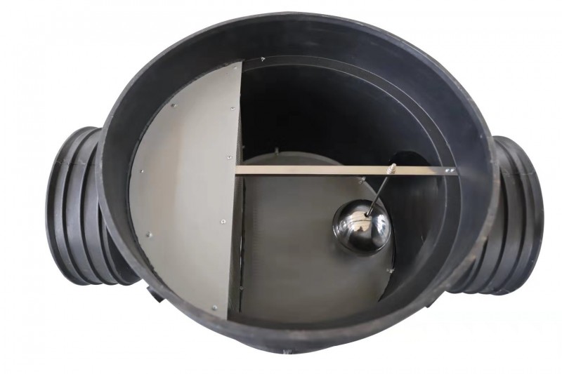 弃流装置:初期降雨时,前期2-5mm雨水污染流量小。经弃流装置时,因重力作用,雨水先通过低位敞口的排污口放掉。雨量增大后,位于排污管上方的浮球在水流浮力的作用下将排污口关闭,水位升高,雨水通过水平的过滤网进行过滤后流向出水口,进行收集。雨停后,装置中雨水量减少,浮球在重力的作用下自动复位,将桶中过滤产生的垃圾带出,从而实现初期雨水的弃流、自动排污等多功能。