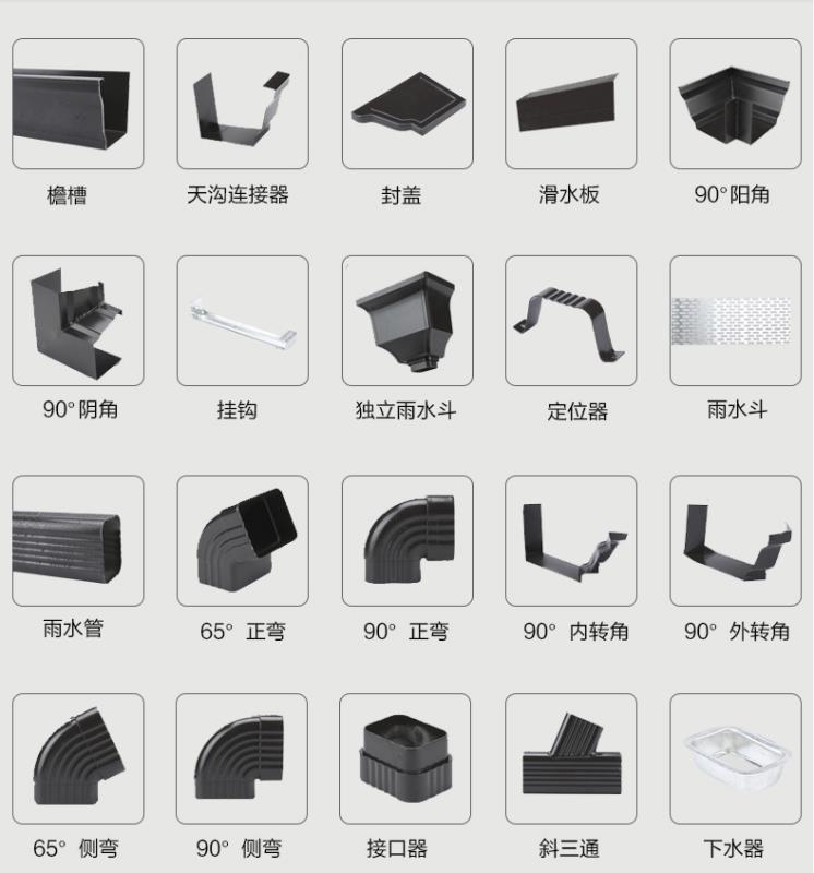 别墅金属落水系统也称别墅屋面雨水排水系统,由屋面天沟,雨水管及相关组件组成,能有效地汇集屋面雨水,有组织地将雨水。合理排离建筑物,从而在完成屋面雨水排放的同时很好地保护房屋的外产面和地基,尽量地延长建筑物的使用寿命,同时还起到一定的装饰美观效果。从材质上分,别墅落水系统有PVC别墅落水系统,金属别墅落水系统两种,金属落水系统在北美及欧洲已被广泛应用,有半个世纪的历史,自2005年左右被引入国内市场,因更耐用,美观,安装便捷,性价比优,已成为国内别墅必备的建材之一。成品檐沟与成品天沟的区别: