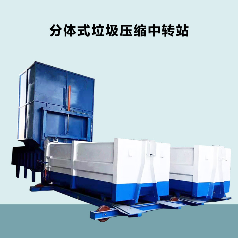 分体式垃圾压缩机上料方式可设计为:前翻斗翻转上料、侧翻斗翻转上料、后翻斗翻转上料、平台上料等几种式;配套转运车辆为车厢可卸式垃圾车,具有压缩力大、处理效率高、机构运行可靠、可自动循环操作和智能监控、使用寿命长等特点。