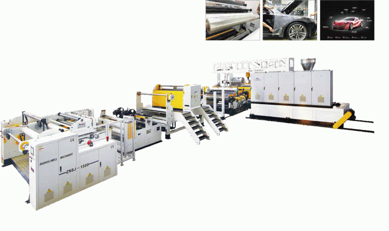 TPU隐形车衣是一种高性能新型环保薄膜,被广泛应用于汽车美容保养行业,是透明漆面保护膜的一种俗称。具有超强的韧性,装贴后可使汽车漆面与空气隔绝,持久具有高光亮度,经过后续加工,车衣膜具有刮擦自修复性能,持久保护漆面。本生产线采用特殊设计的专利流延复合成型技术,针对TPU脂肪族材料特殊的挤出螺杆设计,配备全自动上下离型膜放卷装置,膜片厚度在线自动调节控制,全自动化收卷系统等行业先进的成熟技术,实现生产线的自动化稳定运行。