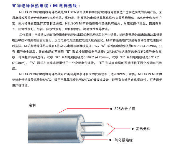矿物绝缘伴热电缆MI电伴热线是采用金属导体作为发热元件,护套为825合金材料,采用氢化镁,作为绝缘材料。MI电伴热线的输出功率由输入的电压与导体的阻值决定。Nelson的MI电伴热线最高暴露温度为593℃。独特的制作工艺使得电缆的管壁非常薄,有柔性并易于安装。