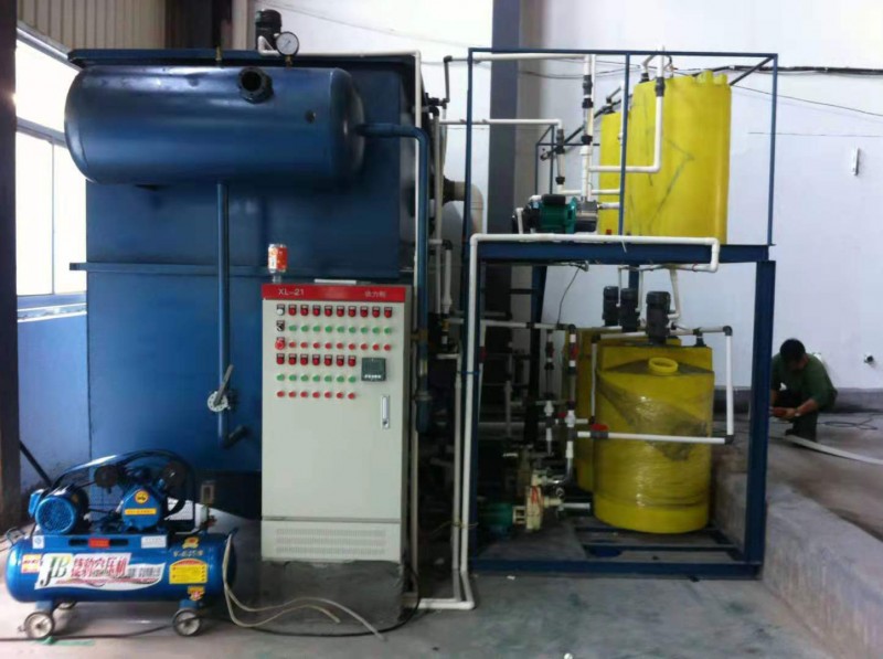 自动化溶气气浮机,不需要人工操作,能够根据来水水量的大小自动开停。大大节省了人力物力,降低了成本,提供了效益。空压机将空气打入溶气罐,在压力作用下,空气溶解于水,并达到饱和状态。通过释放器将溶气水释放出来,并形成微小气泡。经加药反应后的污水进入溶气释放室,与溶气水混合,絮凝体黏附在微小气泡上。在气泡浮力的作用下絮凝物浮向水面形成浮渣,浮渣积聚到一定厚度,由刮渣机刮入污泥池,从而达到去除SS、COD的目的。