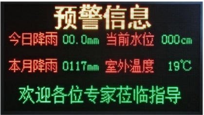 新型山洪入户预警系统蓝芯电子LXDZ-WXP-01型预警大屏具有接收以太网、GPRS平台、短信、入户型简易雨量站、入户型简易水位站数据,通过LED显示文字预警信息。设备可自动发布预警信息,支持本地控制发布日常通知。