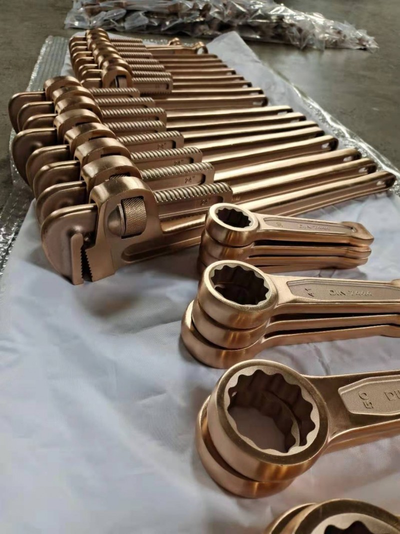 安全无火花工具,防静电工具,消防专用工具,油田专用工具,德标钢制模锻工具:产品采用铍青铜,铝青铜合金材料,经过摩檫压力机模锻而成.机械性能强.材质:铍青铜和铝青铜两种;包装为:内塑料袋,外纸箱或木箱。铍青铜在易燃气体氢气(浓度21%)空间连续使用均确保安全,冲(撞)击、摩擦、落锤均不产生火花。符合II 类C级性能。铝青铜在易燃气体乙烯(浓度7.8%)空间连续使用均确保安全,冲(撞)击、摩擦、落锤均不产生火花。符合II 类B级性能标准。适用于油气运输,油站,燃气站,气体场所抢修,检修电工班等专用组合套工具。