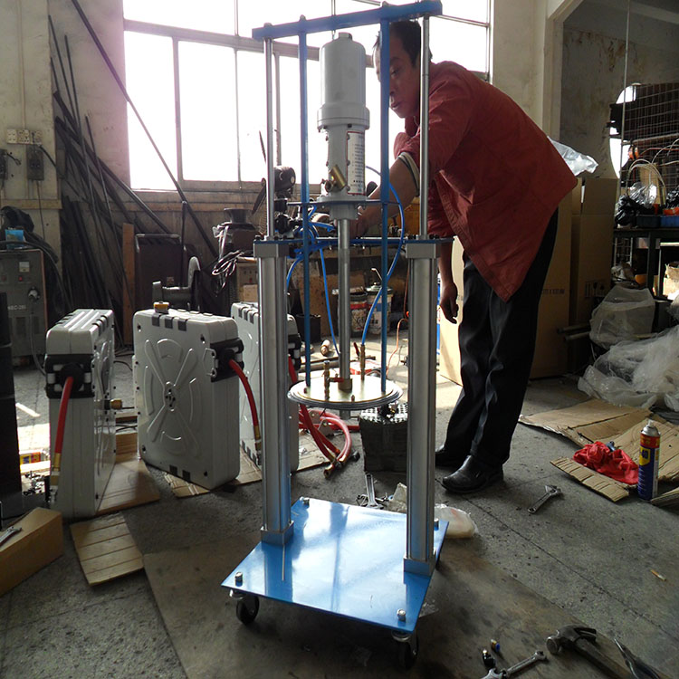 高粘度油脂加注机,配置高粘度用气动柱塞泵、装有便于吸取高粘度材料的压油盘、空气升降机、作为高粘度材料吸出装置进行使用。 通过操作升降机、泵和圆形盖可以进行升降。 升降机仅需通过转换阀进行升降、就可以简单地进行油桶交换。 另外、配有标准底板、所以在任何地方都可以简单地进行设置。