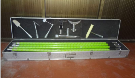 除冰器具操作头按照作用设计成不同形状,使用时可以通过敲、铲、钩等方式有效除去瓷瓶、支架、导线及杆塔上的积雪及覆冰。使用时,根据需要从套件中选取合适的除冰器具,将其安装到绝缘杆的一端并拧紧后即可使用。绝缘杆分为长、短两种规格,可以根据现场情况进行任意组合,以获取合适的长度来满足不同场合的需求。