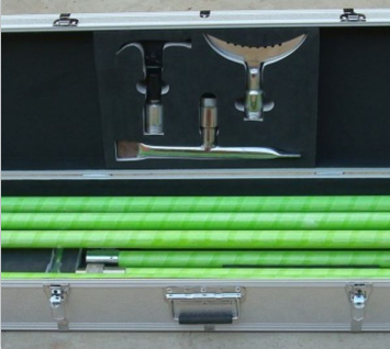 除冰器具操作头按照作用设计成不同形状,使用时可以通过敲、铲、钩等方式有效除去瓷瓶、支架、导线及杆塔上的积雪及覆冰。使用时,根据需要从套件中选取合适的除冰器具,将其安装到绝缘杆的一端并拧紧后即可使用。绝缘杆分为长、短两种规格,可以根据现场情况进行任意组合,以获取合适的长度来满足不同场合的需求。