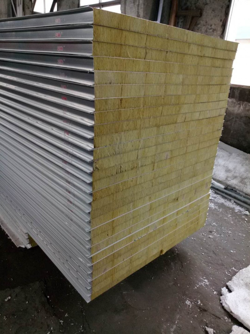 采用中高密度岩棉为芯材,彩涂钢板为面层(两层)及高强度粘剂,通过高速连续自动化成型机加温、加压复合,经过修边、开槽、下料面成的新一代建筑装潢板材,具有保温隔热、安装便捷的特点,是同类(夹芯板系列)中耐火性能强的一种新型防火板材,防火级别为A1级。