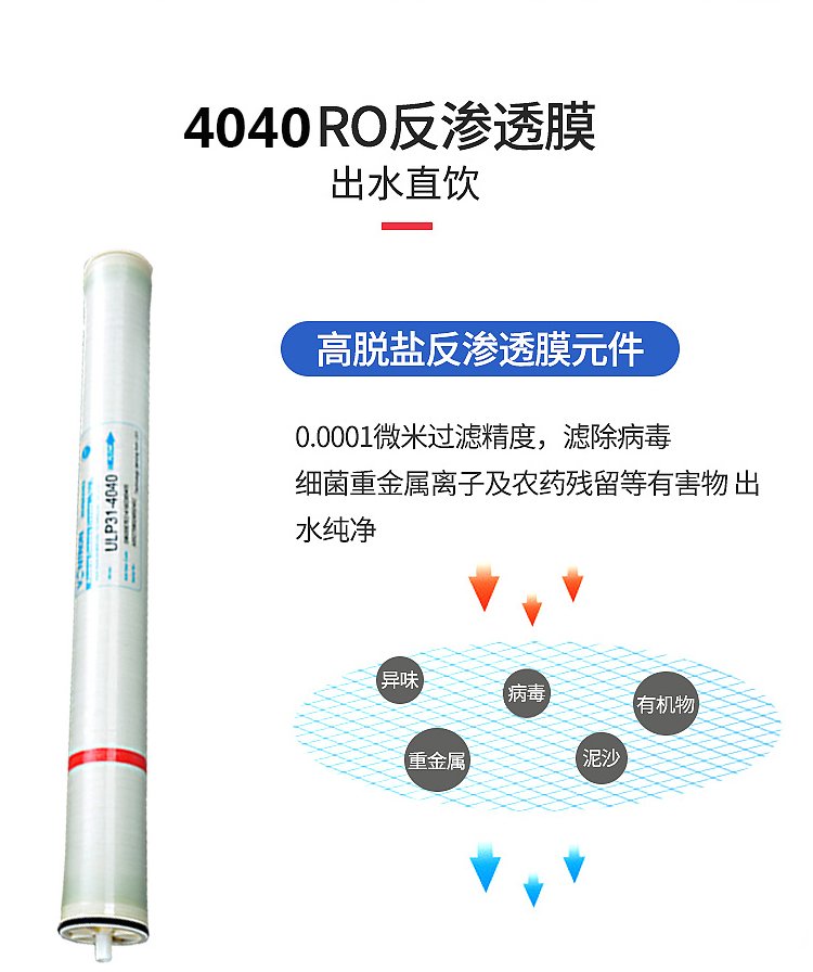 反渗透膜的4040、8040代表的是膜的规格大小。前面40代表长度,1米左右。后面的80和40代表膜的直径,20公分/10公分。