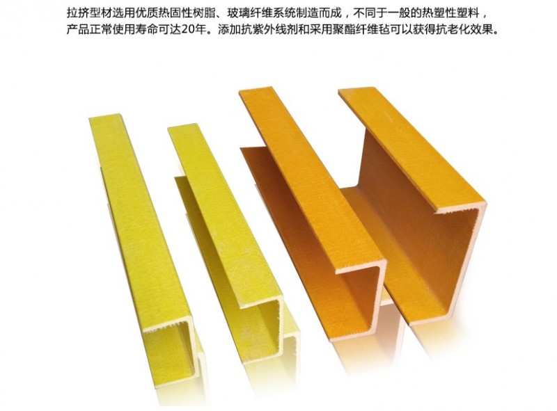 玻璃钢槽钢是由无碱无捻玻璃纤维合股粗纱,经整经并浸以聚酯树脂或环氧树脂连续引拔成型、加热固化而成,具有较高的机械性能和介点性能,并且按照不同模具可以制成各种形状截面的棒材满足用户不同需要。