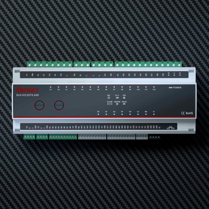 1、基本配置为电源模块,2路0-10V调光,12路10A继电器输出,1路30A大功率继电器输出,1组空调风机输出;预留扩展板输出,满足客房内对调光、照明、窗帘、空调的控制,主机485端口可扩展强电和弱电模块,可满足回路或开关更多场合环境。
