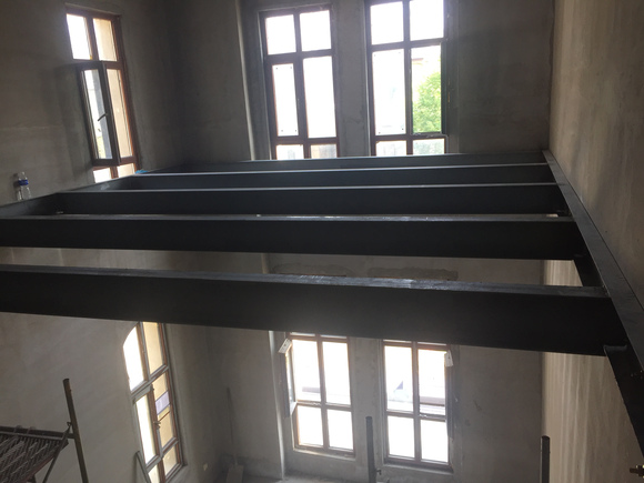 阁楼工艺材料及方式有很多选择:有木质钢结构阁楼;现浇钢结构阁楼;铁板钢结构阁楼;钢结构阁楼等。各有优势,钢结构阁楼以其施工快捷,安全稳定,强度高,得到广泛用在别墅、复式楼房,需要隔空的建筑上。钢材与混凝土及木材相比,其屈服点抗强度要高的多,在承载力相同的条件下,钢结构构件截面小轻,便于运输和安装。这些都有利于楼房内制作结构,同时也会大大的减轻结构因自重对房体本身的冲击。同时钢结构制作简便,施工周期短,无需保养。后期装饰连接简便。这些优点都有利于楼房结构内的改造与加固。施工案例:大兴区如苑宾馆、丰台汽车商贸城、望京香颂、朝阳天鹅湾、昌平医院、房山西潞园、通州宋庄艺术区、西单商场、西山国际城、一栋洋房、万年花城、朝新嘉园、朝阳青年宫社、智地香蜜湾、润泽悦溪,孔雀城等钢结构施工方案 一、 主要材料:12#工字钢、8#螺纹钢、6#盘条、0.8楼层板、TGI-M12膨胀栓、钢结构专用防锈涂料、轻体陶粒、水泥、石灰等。 二、 工艺流程: 预埋件确定→现场实际标高确定(确定主梁及次梁长度)→边框(接点)处理→主梁固定→次梁固定→板面焊接→钢丝网加固→轻体陶粒混凝土浇筑→主结构验收→除锈防锈(防火)。 三、 施工规范: 1、 确定预埋件:先去除墙皮,将预埋件裸露在外,以确定其具体位置和尺寸,做主梁下料、连接的依据,去除墙皮时按照原墙面的标记展开去除,以免造成不必要的墙皮脱落,预埋件按设计要求在墙面深处5mm处,其规格为100*200*10mm。 2、 现场标高确定:根据预埋件的具体位置而确定标高。如果现场标高同原设计有所不同,必须请示公司设计部,待二次设计方案确定后方可施工,现场标高打水平线。 3、 主梁边框(接点)制作:边框采用100*7mm角钢做主料,用YGI-M12mm膨胀栓将预埋件固定,固定点间距≤700mm。 4、 主梁准确长度经过现场实测,其误差≤10mm,做到一梁一测量,然后建立数据册,按照数据册统一下料。次梁根据主梁间距确定,其误差≤5mm.